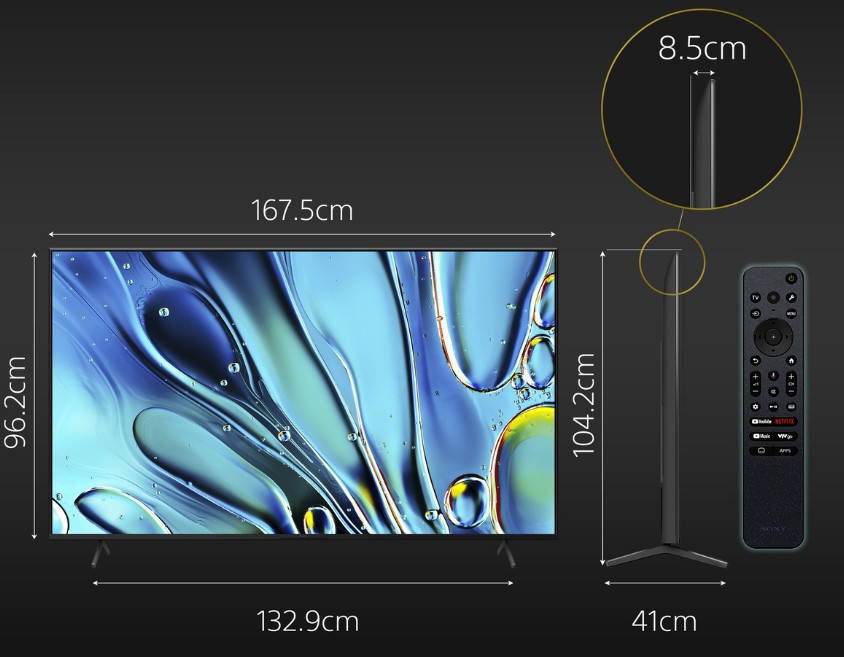Tivi Sony sỡ hữu màn hình kích thước lớn 75 inch, viền tivi siêu mỏng được làm từ nhựa, phù hợp lắp đặt ở những không gian rộng rãi như phòng ngủ, phòng khách hay phòng làm việc,...