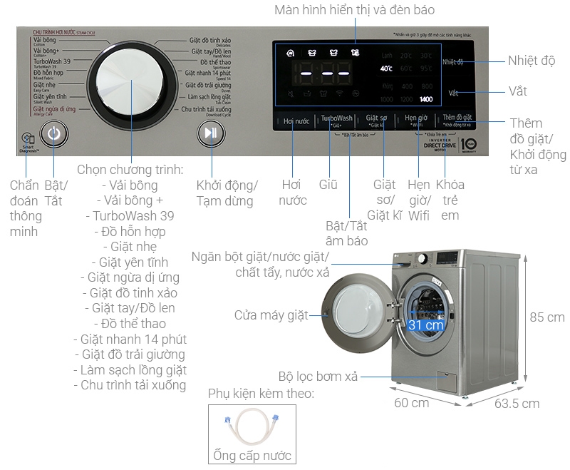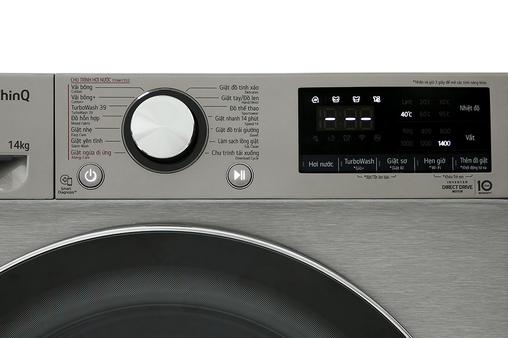- Tích hợp sẵn 14 chương trình giặt tiện lợi, bao gồm: giặt yên tĩnh, TurboWash 39, giặt chăn ga, giặt nhanh 14 phút, giặt ngừa dị ứng, giặt tay + đồ len, đồ thể thao, đồ tinh xảo,... Trong đó, chương trình giặt nhanh chỉ phù hợp với số lượng quần áo ít và không bị bẩn nhiều như khăn tay, tất, đồ thể thao,... giúp tiết kiệm thời gian giặt giũ.