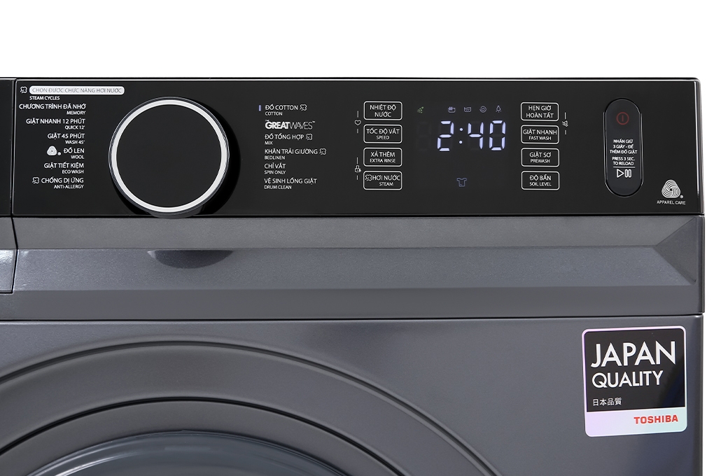 Ngoài ra, bảng điều khiển có dạng nút xoay mạ gương sáng bóng lẫn phím cảm ứng được trang bị song ngữ Anh - Việt và màn hình hiển thị rõ ràng, giúp thao tác các chức năng máy giặt nhanh chóng, dễ dàng hơn.
