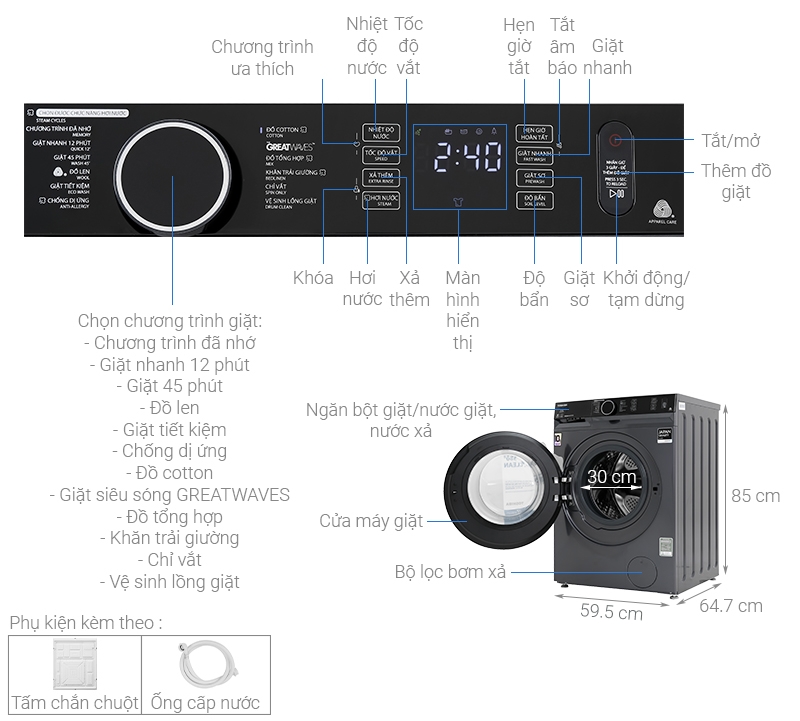 Máy giặt bao gồm 8 chương trình giặt nổi bật: giặt nhanh 12 phút, chống dị ứng, giặt siêu sóng Greatwaves, giặt tiết kiệm, đồ len, giặt 45 phút, đồ cotton, vệ sinh lồng giặt đáp ứng tốt nhu cầu giặt của gia đình bạn.