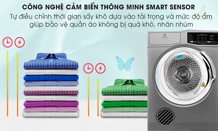 Cảm biến Smart Sensor của máy sấy với khả năng nhận biết được trọng lượng cũng như độ ẩm quần áo cần sấy, từ đó tự động điều chỉnh thời gian sấy phù hợp nhất. Giúp quần áo được sấy khô hiệu quả, không bị quá khô gây hư hỏng hoặc làm nhăn nhúm quần áo của bạn.