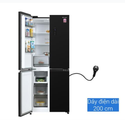 - Tủ lạnh sử dụng thiết kế Multi Door 4 cánh với chất liệu cửa tủ là kim loại phủ sơn tĩnh điện, mang tông màu đen sang trọng phù hợp với các không gian nội thất như phòng khách và phòng bếp, làm tăng vẻ đẹp cho không gian.