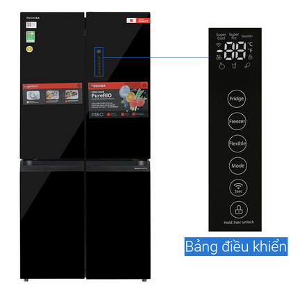 - Tủ lạnh Toshiba Inverter 474 lít Multi Door GR-RF611WI-PGV(22)-XK được thiết kế theo kiểu tủ multi door với nhiều ngăn kéo linh hoạt, dễ dàng phân loại thực phẩm. Mặt kính cường lực màu đen sang trọng, chịu lực tốt, độ bền cao cùng bảng điều khiển cảm ứng bên ngoài cửa tủ tiện lợi.