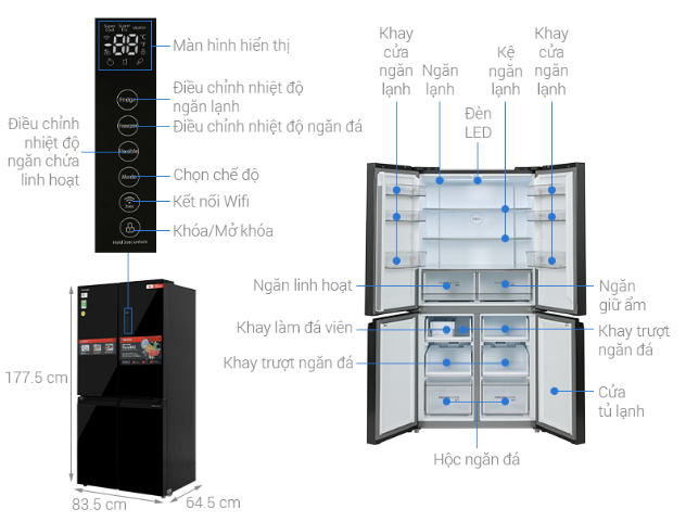 - Hai bên cánh cửa tủ của ngăn lạnh thiết kế 6 khay chứa, có khoảng cách nhất định giữa các vùng dùng để đặt thực phẩm, chai nước cổ cao thoải mái.